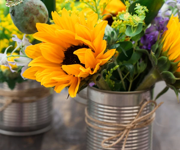Que tal uma composição com vários vidrinhos ou garrafas que você já tem em casa? Você pode apenas colocar diversas variedades de flores e fazer uma composição bem linda, ou pode decorar os vasinhos com barbante ou tecidos.