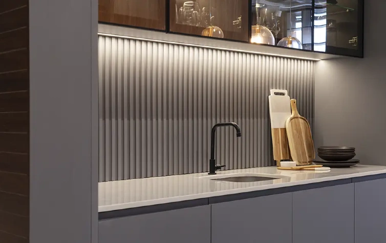 A Italínea oferece soluções de mobiliário que dialogam com a iluminação de forma natural. Cristaleiras com LED interno, nichos iluminados, painéis ripados com luz embutida e roupeiros iluminados reforçam o design dos móveis e tornam o ambiente mais elegante e funcional. Nas cozinhas, a combinação de luz para tarefas e luz ambiente cria equilíbrio entre o uso diário e a estética.